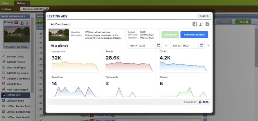 6. Once your listing ad is live based on the date selected, return to the Listing Ads modal to manage the ad and view engagement insights: